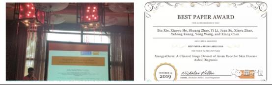 不只如斯,获得了医学影像计较机辅帮诊断范畴的最高学术会议MICCAI 2019 LABELS Workshop的最佳论文。何小宇还完成的亚洲人种皮肤病临床图像数据集论文,